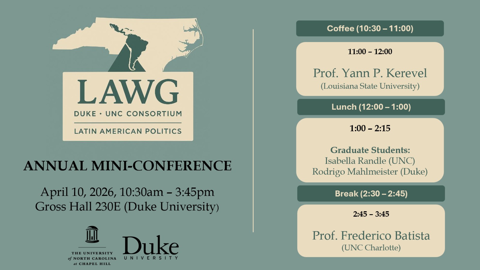 9 Apr 2026 (LAWG) ANNUAL MINI CONFERENCE by Miguel Rojas | posted in: Uncategorized | 0 THE LATIN AMERICAN POLITICS WORKING GROUP (LAWG) invites you to the: ANNUAL MINI CONFERENCE MORE INFORMATION: Rodrigo Mahlmeister <rodrigo.mahlmeister@duke.edu>